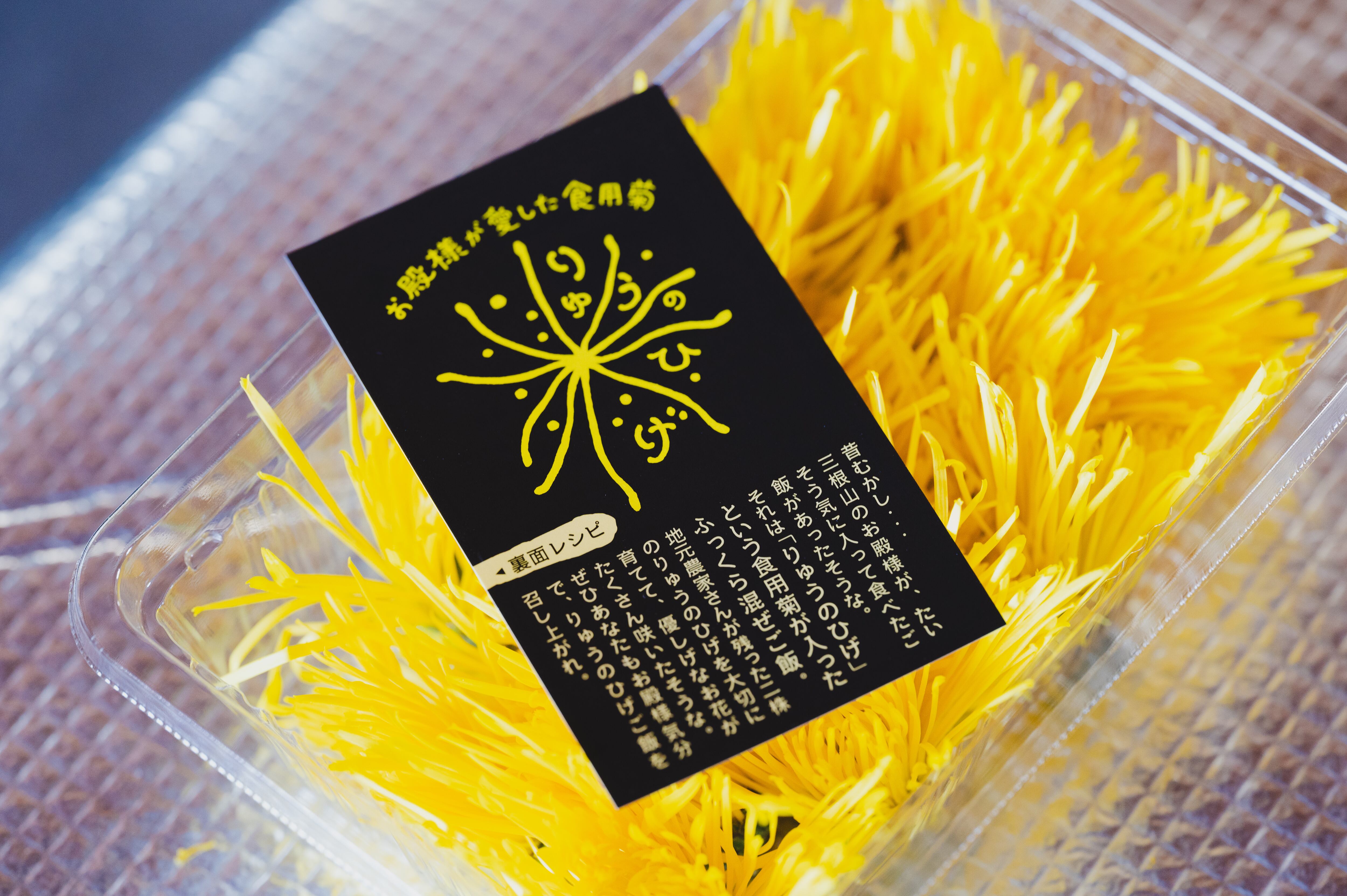 般に出回る食用菊と比較すると花びらが細く、繊細な形状。風味は強く、菊らしい上品な香りがある。、他の食用菊と比較し食味はシャキシャキとしている